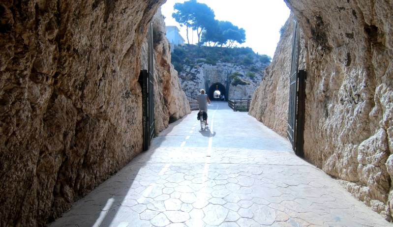 Dapper stapten wij dan ook op de fiets en we reden een leuke route ..., langs het strand, door een tunnel en die kwam weer uit op een nieuw uitgestrekt strand. Had deze route ook alleen al eens gereden en wilde het graag ook aan John laten zien.