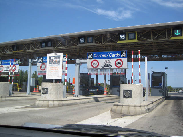 Waar te rijden? .... met een camper? We waren hier totaal niet op voorbereid. We reden maar zoveel mogelijk rechts naar een tolpoort, zonder creditcard erboven. Het was onbemand met een automaat. Vooraan dit punt stond aangegeven ... personenauto's € 2,80 en vrachtauto's/busjes? € 4.40. Hadden we kleingeld? Vlug zoeken ... en gelukkig hadden we het! Maar waar dit geld nu in te gooien? Weer zoeken...